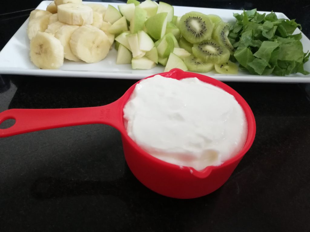 But, I’m not getting any younger and it’s high time I gave my kids a good example, so, on a much healthier note, we have decided to try more new things. We have managed to get into a few good habits this Ramadan, as well as get rid of some bad ones. Why not kick off our new found intentions with this green kiwi smoothie, using nothing but fruit, yoghurt, and yes, fresh spinach!