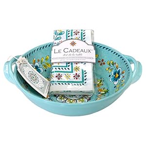 Le Cadeaux Madrid Turquoise Melamine 9.25″ Salad Bowl with Handles and Tea Towel Set
