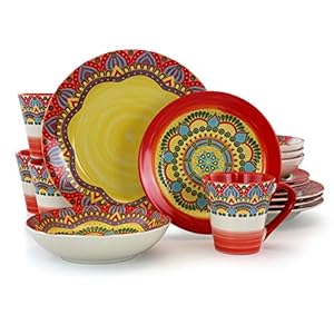Elama Multicolored Round Stoneware Mandala Pattern Dinnerware Set, 16 Piece, Red