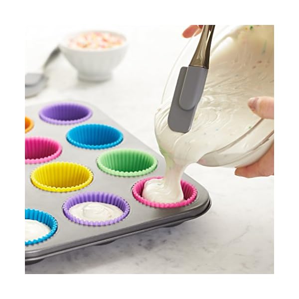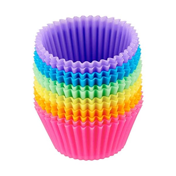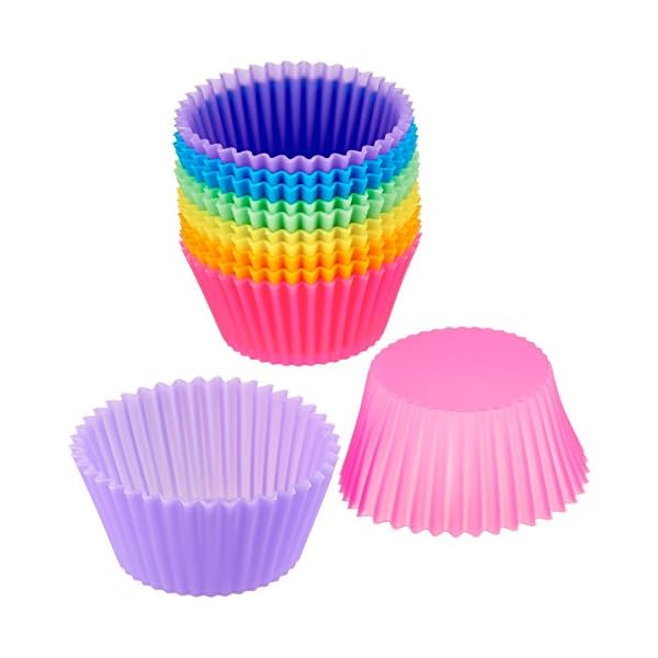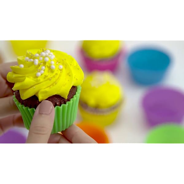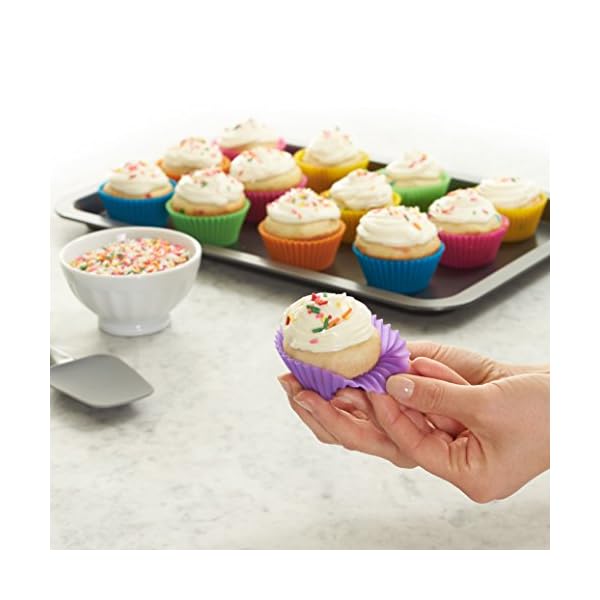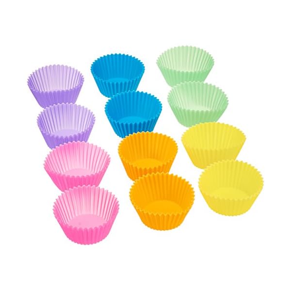 12-pack of reusable baking cups; made of food-grade silicone; ideal for baking, lunch/snack cups, and more