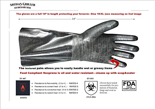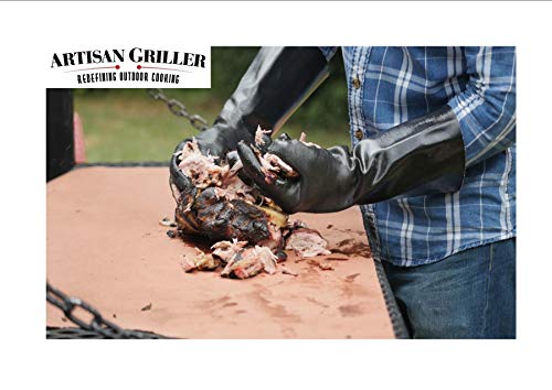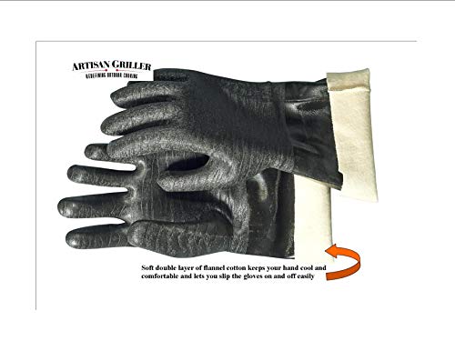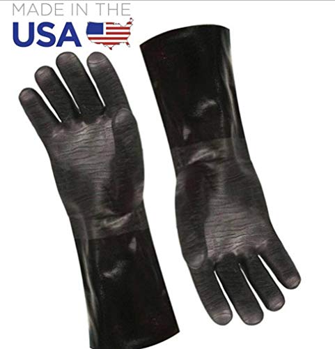 - COMFORTABLE & FLAME RESISTANT – The Pit Glove has a soft jersey cotton liner that fits loosely so your hands stays cool and comfortable while smoking meats, pulling pork , baking, pickling and other household tasks. The food grade neoprene coating is EN 407 compliant and resistant to melting and is fire resistant, protecting your hands around smokers, grill flames and fire, making them a great camping accessory.