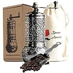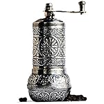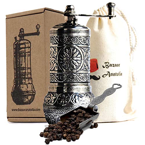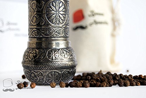 Ottoman style, traditional pepper grinder is both decorative and functional. Vintage spice grinder with a short handle, detachable ornate holder and sliding pour hole. With corrugated rollers Turkish spice grinders produce a more even grind size distribution
