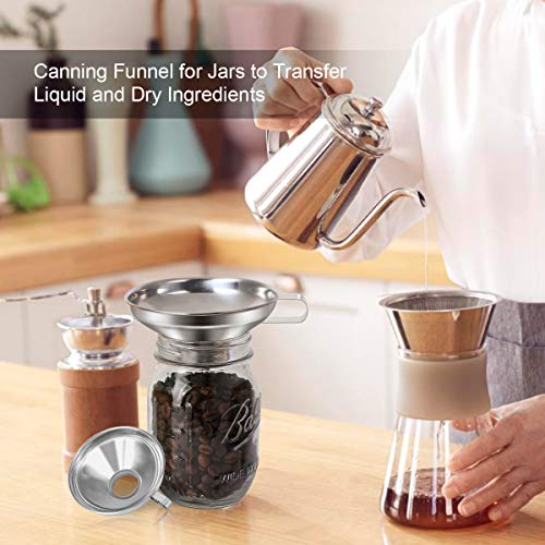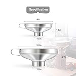 Stainless steel funnel size, large canning funnel dimension: 5.6” (Width)* 2.3” (Height)*1.6” (Diameter), small canning funnel dimension: 4” (Width)* 1.8” (Height)*1.5” (Diameter), dishwasher safe