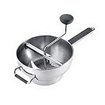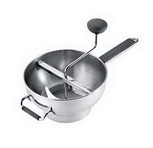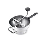 With a simple turn of the ergonomic, non-slip handle this durable stainless steel food mill purees a wide variety of fruit and vegetables while straining out skins, seeds and pulp. Instead of manually scraping the underside of the mill, the innovative scraper automatically scrapes as you turn. This increases efficiently by allowing a smoother, more continuous flow of food. The deluxe food mill also sits high in you pot or bowl keeping the mill out of the food. Comes with 3 different size straining disks; 2mm, 3mm; 4mm. Comes part for easy cleaning.