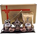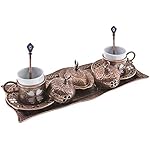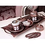 16 Items Engraved Turkish Greek Espresso Complete Set. Made in Turkey. 1 2mm Thick Copper Espresso Pot. 8 OzCapacity. 2 Porcelain Cups with Saucers, Lids, Holders. 2 OzCapacity. 1 Large 1 Small Sugar/Turkish Satisfaction Bowl with Lids. 1 Tray. 2 Top rate Mehmet Efendi Turkish Espresso. 3.3 Ozevery.