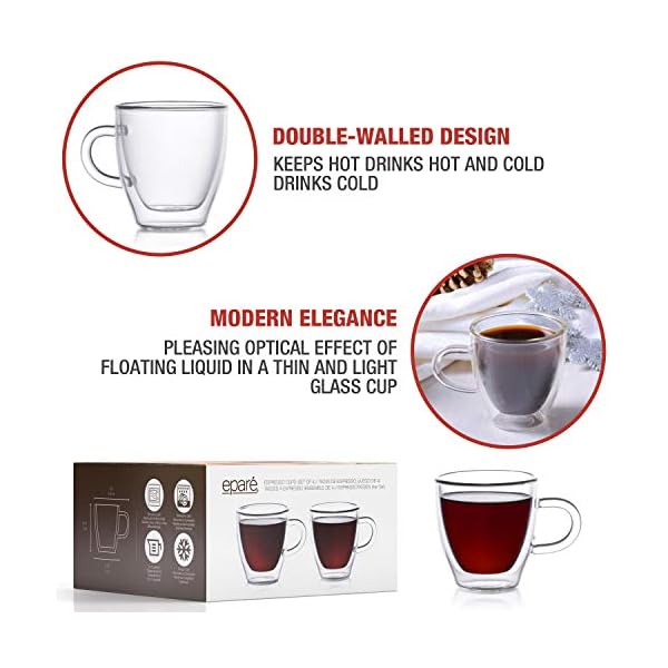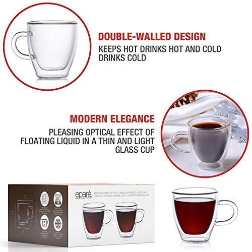 EPARÉ TRUSTED QUALITY: You will receive two (2) Espresso Glasses measuring 2.5 inches across, 2.5 inches wide and 3.5 inches high, with a weight of 2.08 ounces and a 2 ounce capacity. We stand behind our quality.