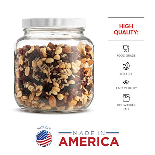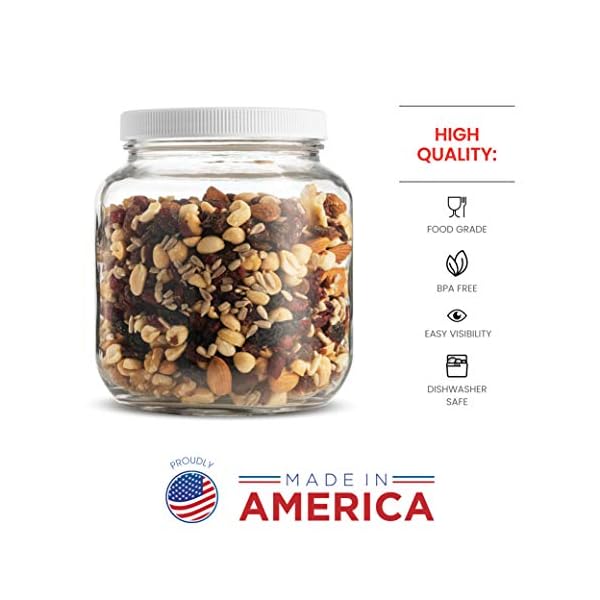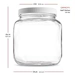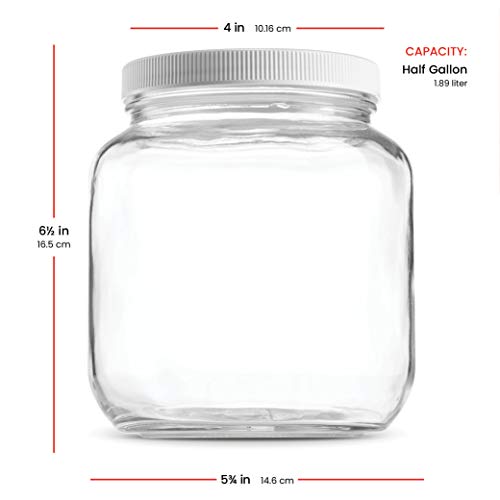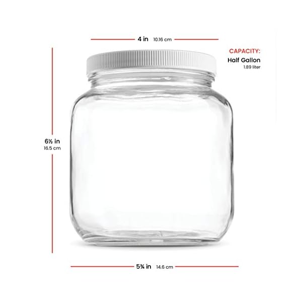 Quality: Each Half gallon Glass jar is made in the USA of high quality, thick-grade soda lime glass that has been certified by the USDA as food safe; the lid is made of BPA Free Plastic ensuring no chemicals ever leach into food or beverages. Dishwasher safe. Dimensions: 5 ¾” x 6½”