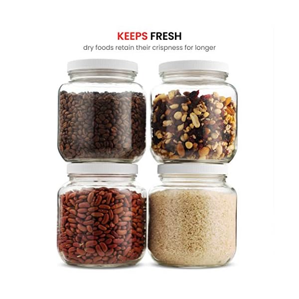 Storage: An airtight seal lid keeps food fresher for longer in our glass Half gallon dry food storage jars. Store dry foods such as rice, flour, oatmeal, pasta, and candies or store wet foods such as salsas, pizza sauces, etc in the pantry, fridge, or kitchen cupboards.