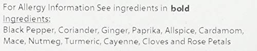 Black Pepper, Coriander, Ginger, Paprika, Allspice, Cardamom, Mace, Nutmeg, Turmeric, Cayanne, Cloves, and Rose pedals