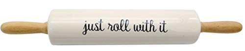 A timeless and functional addition to every baker’s collection! Ceramic rolling pin features witty baking sayings and wood handles Size: 3.5″ x 16″