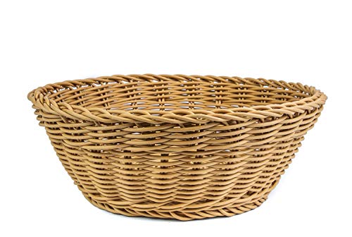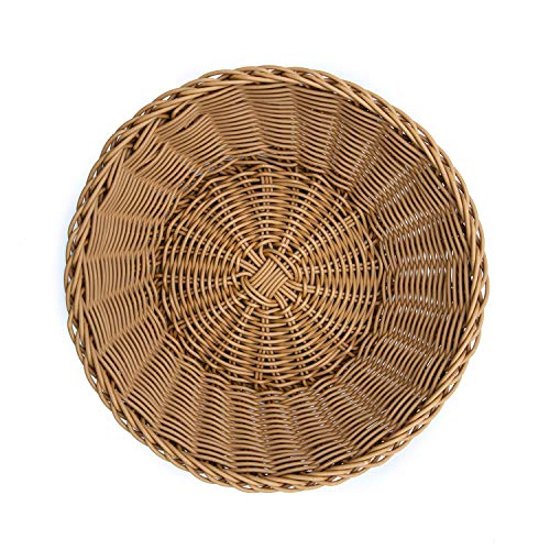 A perfect alternative to the cost and upkeep on natural wicker, the KOVOT Poly-Wicker Round Basket is excellent for displaying and serving bread, bagels, rolls, and pastries. Made of durable, food-grade hand woven polypropylene fibers, the baskets are dishwasher and microwave safe and will not mold like natural rattan. Each bread basket measures: 10.5″D x 4″H.