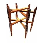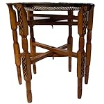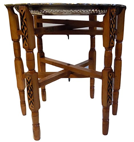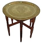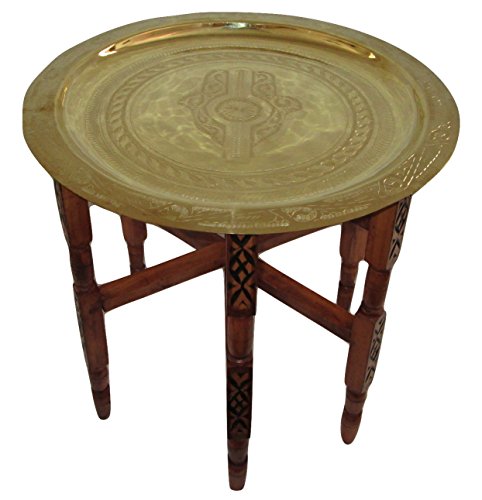 This is a beautiful Moroccan side tea table. The brass top is etched & engraved by hand and placed atop solid wood base, themselves etched in a traditional style. The brass top can be removed and used as a serving tray. The folding base makes it infinitely versatile and ultra-portable. it makes fantastic accent table in nearly any decor. Moroccan Hand Made Traditional Folding Table Polished Brass Tray Top 19″ Diam. – imported from Morocco it has a folding base in Carved wood 20″ high see images in zoom for details You are buying (1) in new condition. The tray has a hook on the back that will allow it to hang on the wall as well and then you can fold the legs and store them away. **This tray can be hung as well**