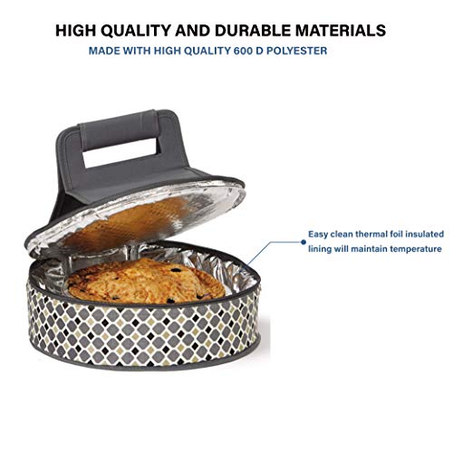 Your apple pie, pecan pie, pumpkin pie, lemon meringue, fruit torte will all travel safely with the hard side walls, lid and base construction. Cake ‘n Carry’s easy clean thermal foil insulated lining will maintain temperature for your desserts and appetizer’s arrival at your destination. Made with durable, 600d polyester exterior.