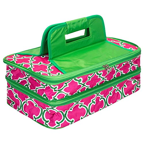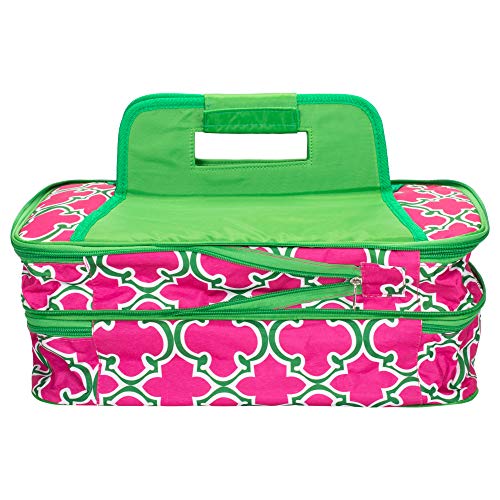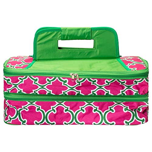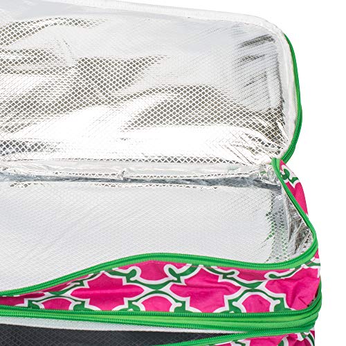 Study and fully insulated food carrier to keep food hot or cold during transport. Measures approximately 17.5 x 11 x 7 inches; Holds up to two (2) 11 x 15 inch/5 quart casserole dishes- not included. Made of quality polyester material and Thermal Shield Insulation; All around zipper closure makes it easy to pack and unpack the carrier. Perfect for carrying casseroles, cakes, rolls, and other food items. Ships in protective packaging.