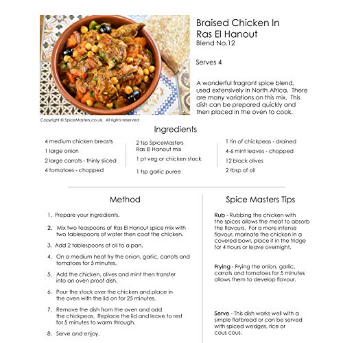 Each pack of Ras El Hanout spice contains just spices and no artificial preservatives or additives. It’s packed full of flavour and a little goes a long way, you are going to receive enough to cook 5 wonderful meals so that it will serve 4 to 5 people each time.