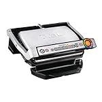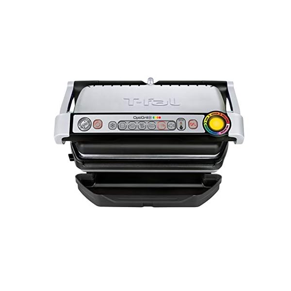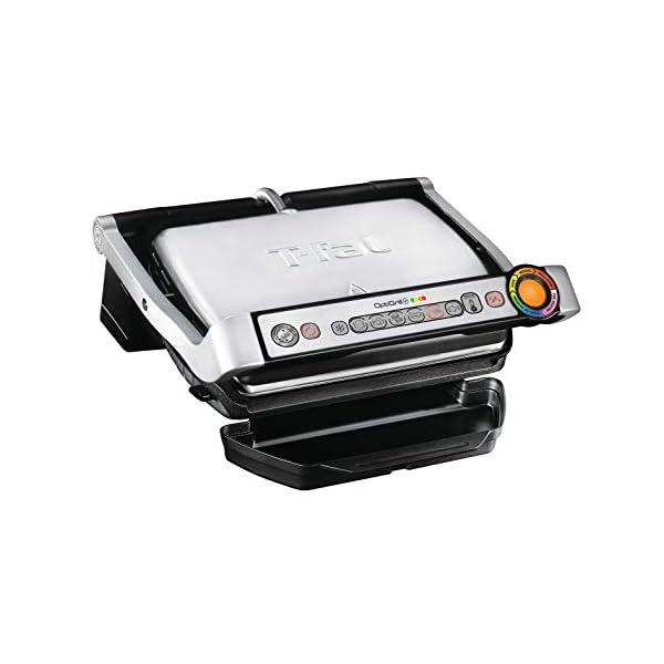 Cook food to perfection with the T fal OptiGrill GC702D53 electric indoor grill. This indoor grill offers versatility and convenience for any grilled meals. Make a choice from six pre set programs: Burger, Poultry, Sandwich, Sausage, Red Meat, and Fish. The grill’s precision grilling technology with sensors measures the thickness of food for auto cooking based on the program selected. When the flashing light turns solid purple, the grill has properly preheated—place food on the grill, lower the lid, and it takes care of the rest. A cooking level indicator light changes from yellow to orange to red signifying the cooking progress with audible beeps that alert when food gets to each stage: rare, medium, and well done. Take food off the grill once it’s reached your preferred level of doneness. In conjunction with the six pre set programs, the electric grill provides two additional cooking options: Frozen mode for defrosting and fully cooking frozen food and Manual mode for cooking vegetables or personal recipes. (Note: when preheating for a pre set program, keep the lid closed or the grill will automatically switch to Manual mode.) The OptiGrill features a powerful 1800 watt heating element, user friendly controls ergonomically located on the maintain, and die cast aluminum plates with a nonstick coating for effortless food release. The somewhat angled cooking plates allow fat to run away from food and into the drip tray for healthier results, and the drip tray and cooking plates are removable and dishwasher secure for quick cleanup. Housed in brushed stainless steel, the OptiGrill electric indoor grill makes an attractive addition to any counter.