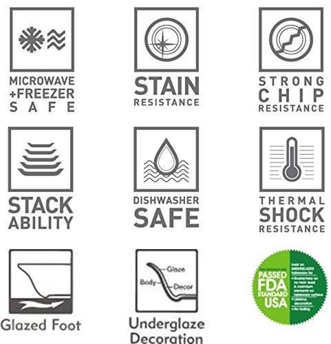 CHIP-RESISTANT AND DURABLE: Fine porcelain, high-quality durable under-glaze decoration, smooth glazed foot to minimize table scratching, stackable. All sets passed USA’s FDA standards and are BPA-free.