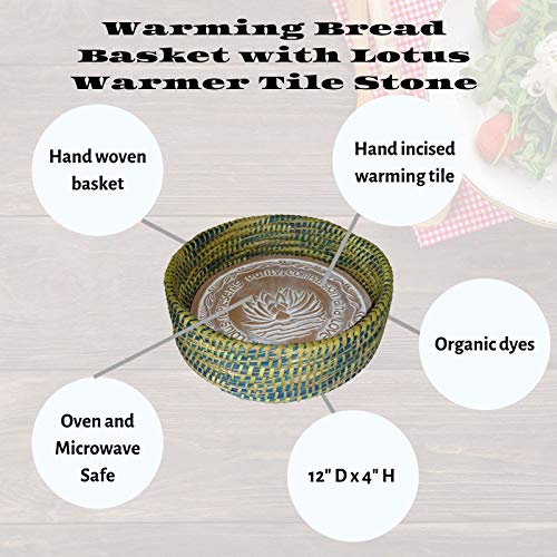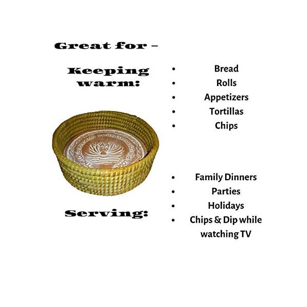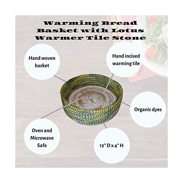 OVEN INSTRUCTIONS: Place the terracotta or clay tile stone inside a 350-450 degree heated oven between 15 to 30 minutes or until warm. Place heated tile in the bottom of the basket, cover with a cloth, fill with bread, rolls, chips or appetizers. Stays warm for about 45 minutes. MICROWAVE INSTRUCTIONS: Place the warming tile on a folded tea towel and place inside the microwave for 2 (two) minutes. Remove from the microwave by lifting the towel and place inside the bread basket.