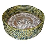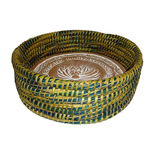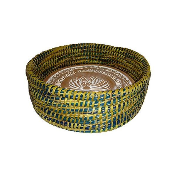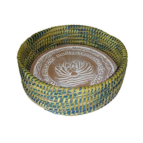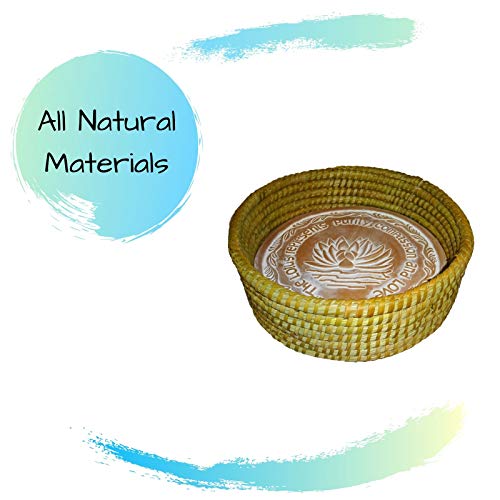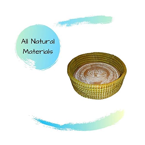 A whitewashed terracotta stone is deeply incised with the Lotus flower design sits inside this basket. The Lotus represents Purity, Compassion and Love.